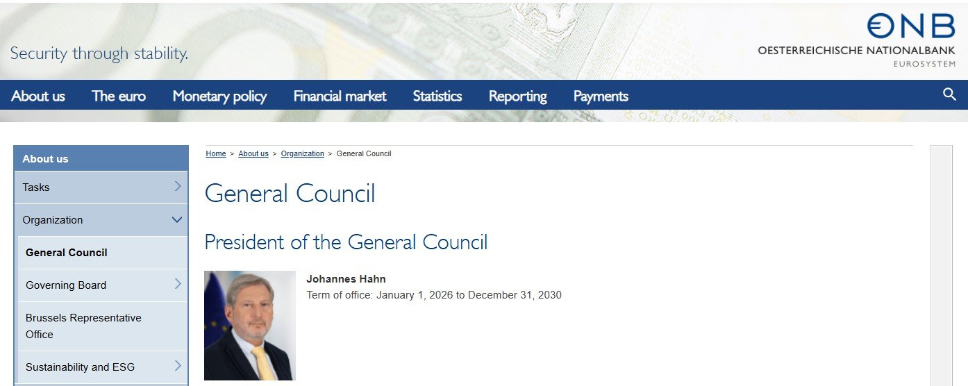 Avusturya Ulusal Bankası, OeNB’nin (Oesterreichische Nationalbank) web sitesinde Hahn’ın, 1 Ocak 2026’dan 31 Aralık 2030’a kadar genel kurul başkanlığı yapacağı duyuruluyor.